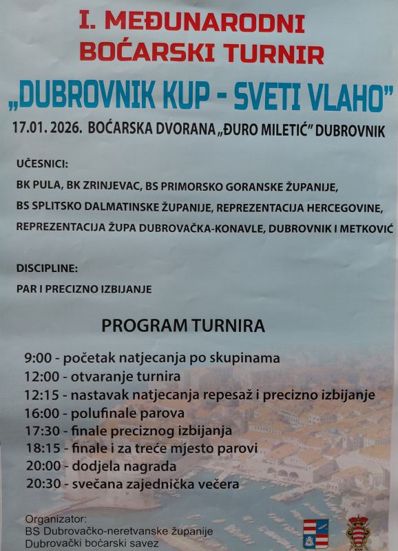 Boćarski savez Dubrovačko-neretvanske županije i Dubrovački boćarski savez organiziraju I. Međunarodni boćarski turnir „Dubrovnik kup – Sveti Vlaho", međunarodni grand prix turnir koji se održava povodom feste Svetog Vlaha u Dubrovniku. Turnir će se igrati 17. siječnja 2026. u boćarskoj dvorani Đuro Miletić, a okupit će osam reprezentacija, saveza i klubova iz Hrvatske i inozemstva.