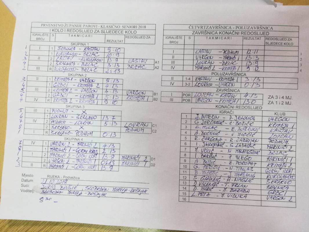 U BC Podvežica ovu nedjelju je odigrano prvenstvo županije za seniore u disciplini par klasično. Nastupilo je 15 parova iz 12 klubova. Titulom prvaka okitio se par ekipe Vargon 1 u sastavu Davor Jelovica i Joško Buterin. Podatak da su i u polufinalu i u finalu svoje protivnike ostavili bez upisanog punta, dovoljno govori o tome da su pokazali najkvalitetniju igru tijekom cijeloga dana.