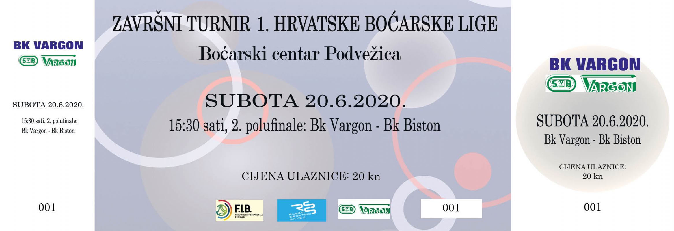 Zbog epidemioloških mjera ograničenja prisutnosti gledatelja u zatvorenim objektima ulaznice za završni turnir 1. Hrvatske boćarske lige će se moći kupiti u pretprodaji dana 18. i 19.06.2020. i to na sljedećim mjestima: